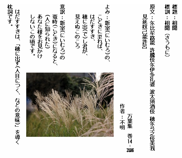 巻14-3506:新室のこどきに至ればはだすすき穂に出し君が見えぬこのころ