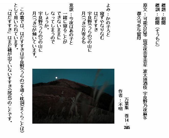 巻14-3565:かの子ろと寝ずやなりなむはだすすき宇良野の山に月片寄るも
