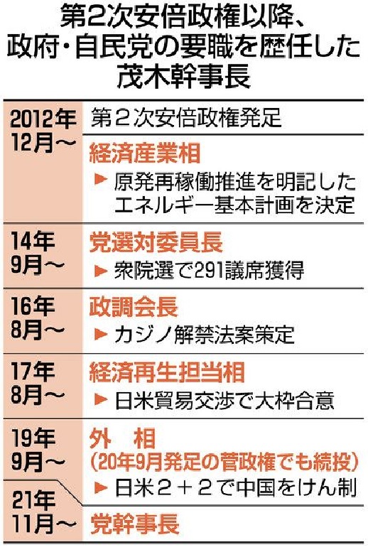 茂木氏自身も首相ポストに強い意欲を持っているとされ、安倍、麻生両氏と親密な関係を維持する。党内には「幹事長を足掛かりに次の首相を目指すつもりだろう」との見方もある。