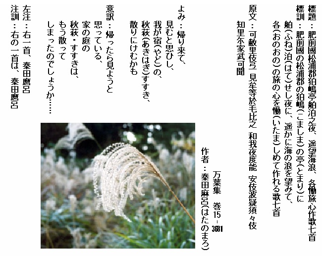巻15-3681:帰り来て見むと思ひし我が宿の秋萩すすき散りにけむかも