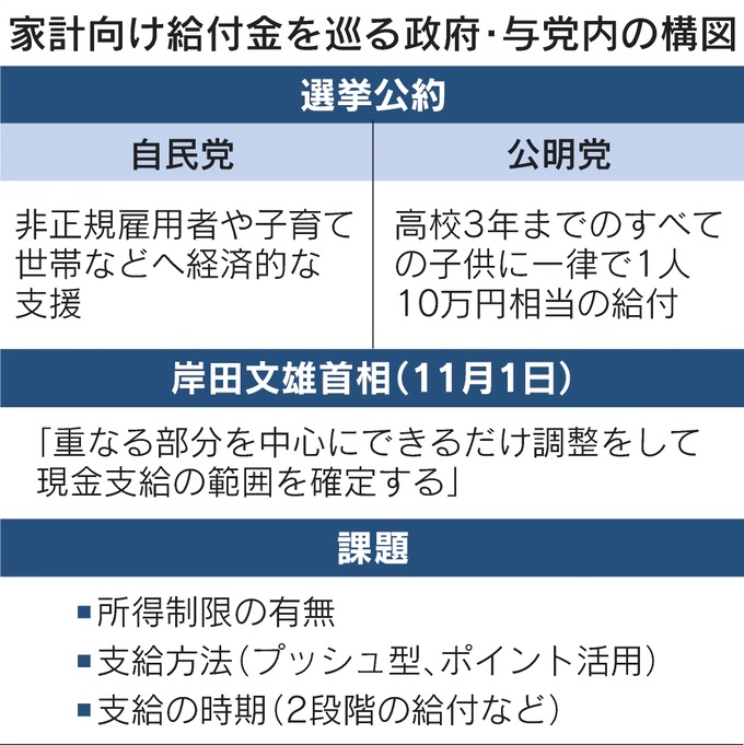 自民党は公約で子育て世帯や非正規雇用者への支援を表明し10万円給付は掲げていなかった。自民党総裁の岸田文雄首相は1日に「重なる部分を中心にできるだけ調整をして現金支給の範囲を確定する」と述べていた。