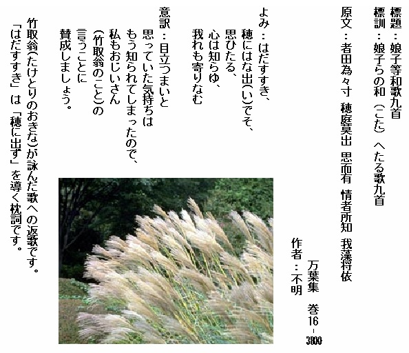 巻16-3800:はだすすき穂にはな出でそ思ひたる心は知らゆ我れも寄りなむ
