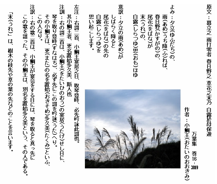巻16-3819:夕立の雨うち降れば春日野の尾花が末の白露思ほゆ