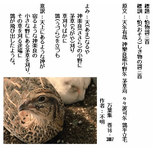 巻16-3887:天にあるやささらの小野に茅草刈り草刈りばかに鶉を立つも