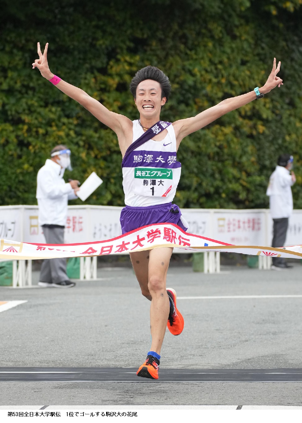駒大のアンカー花尾は残り2キロでスパート。高々と両手でVサインしながらゴールテープを切った。青学大・飯田に並ばれたが我慢強く並走し、突き放した。2位の青学大とは8秒差。史上最小差の激戦を制した大八木監督は「冷や冷やしたよー」と言いながらも、花尾と笑顔で抱き合った。