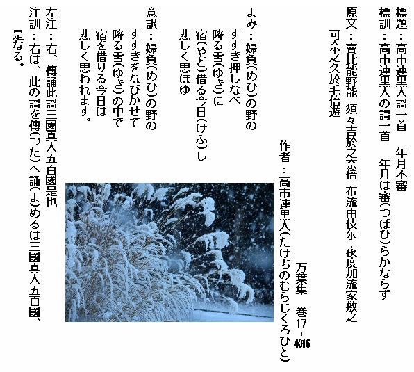 巻17-4016:婦負の野のすすき押しなべ降る雪に宿借る今日し悲しく思ほゆ