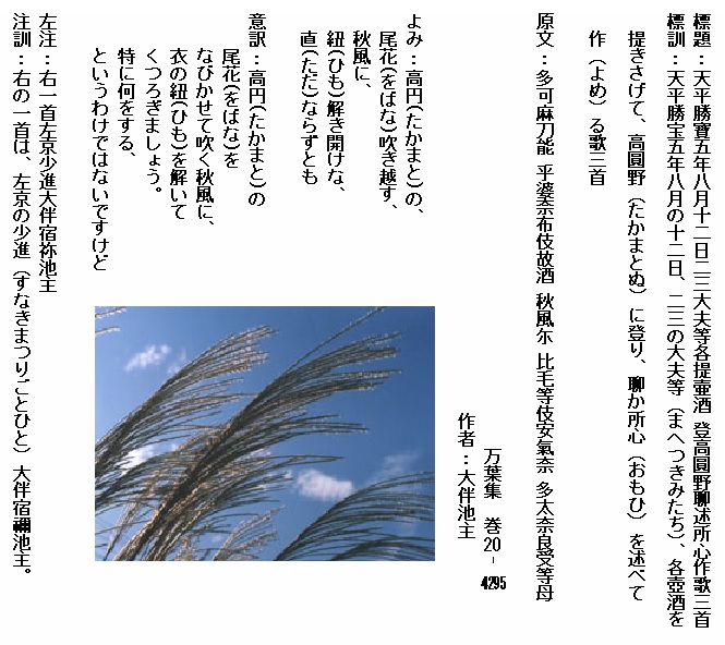 巻20-4295:高円の尾花吹き越す秋風に紐解き開けな直ならずとも