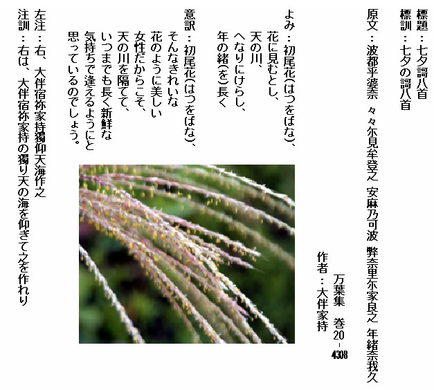 巻20-4308:初尾花花に見むとし天の川へなりにけらし年の緒長く