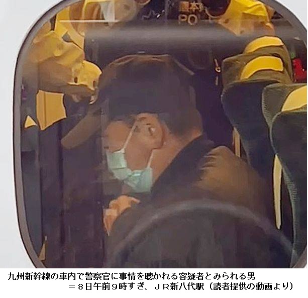 「京王線事件まねた」九州新幹線放火未遂 容疑の男供述 ―― 8日午前8時40分ごろ、県内を走行中の広島発鹿児島中央行きJR九州新幹線「さくら401号」(8両編成)で「車内に火を付けた者がいる」と、JR新八代駅から110番通報があった。JR九州によると、新幹線は緊急停車。座席や床の一部が焼けたが、直後に消し止められ、乗客141人にけがはなかった。八代署は現住建造物等放火未遂の疑いで、福岡市博多区、無職三宅潔容疑者(69)を現行犯逮捕した。