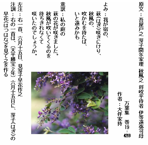 巻19-4219:我が宿の萩咲きにけり秋風の吹かむを待たばいと遠みかも