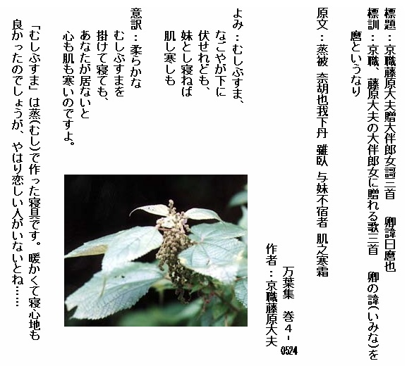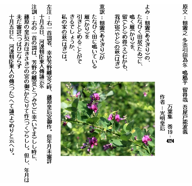 巻19-4224:朝霧のたなびく田居に鳴く雁を留め得むかも我が宿の萩