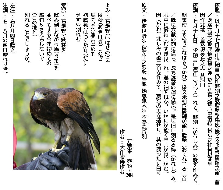 巻19-4249:石瀬野に秋萩しのぎ馬並めて初鷹猟だにせずや別れむ