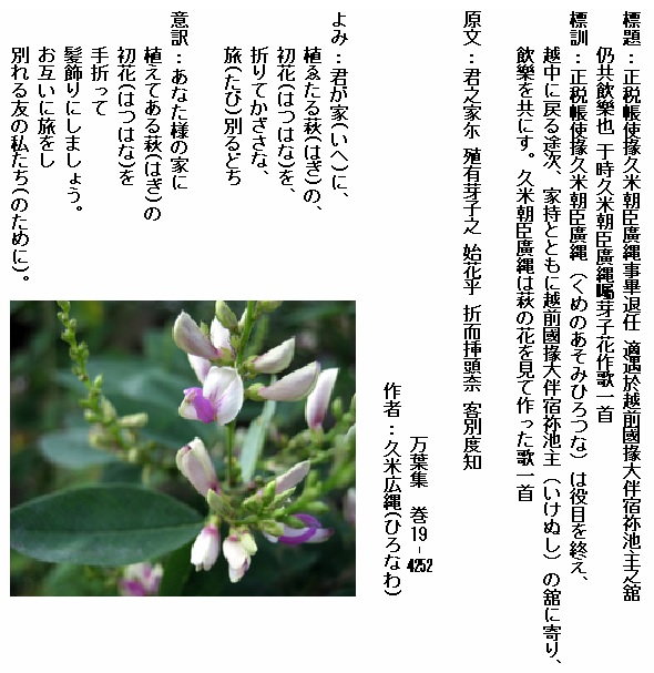 巻19-4252:君が家に植ゑたる萩の初花を折りてかざさな旅別るどち