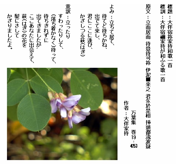 巻19-4253:立ちて居て待てど待ちかね出でて来し君にここに逢ひかざしつる萩