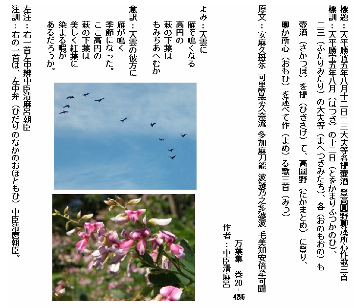 巻20-4296:天雲に雁ぞ鳴くなる高円の萩の下葉はもみちあへむかも