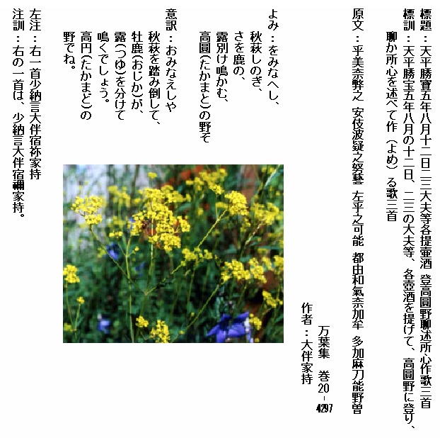 巻20-4297:をみなへし秋萩しのぎさを鹿の露別け鳴かむ高圓の野ぞ