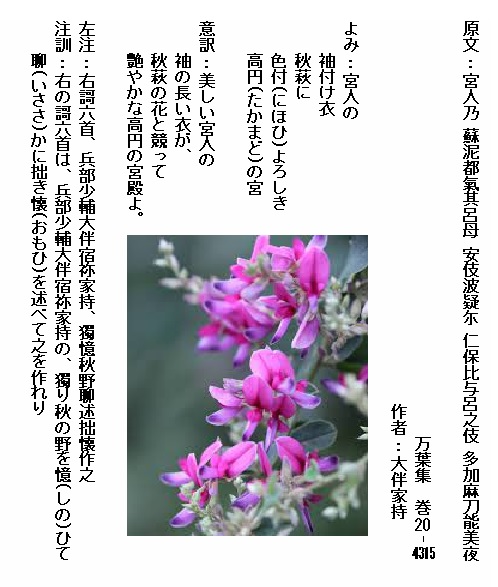 巻20-4315:宮人の袖付け衣秋萩ににほひよろしき高圓の宮