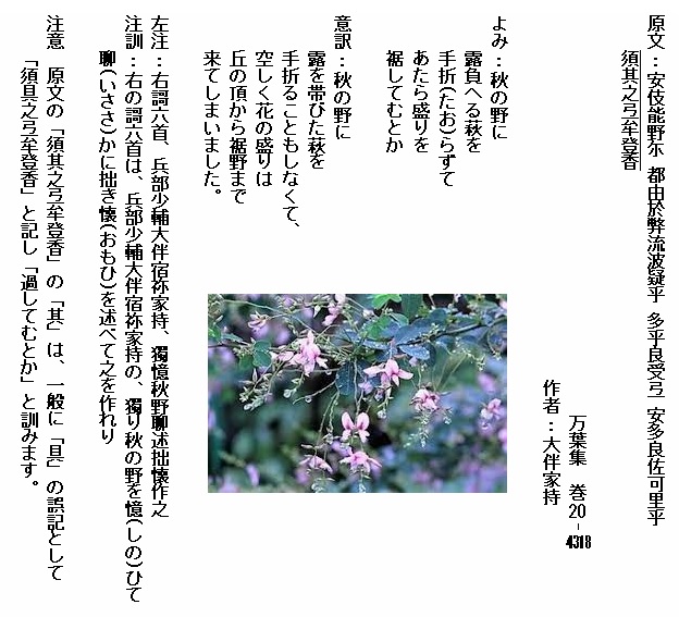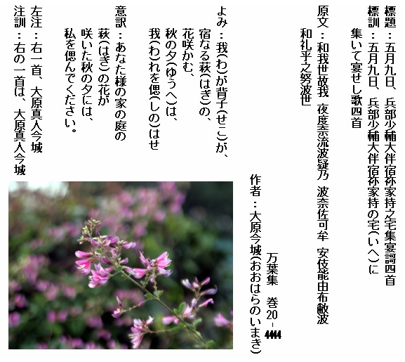 巻20-4444:我が背子が宿なる萩の花咲かむ秋の夕は我れを偲はせ