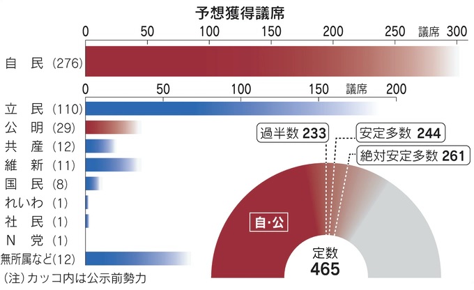 自民は全小選挙区の半数超で議席獲得が「有力」または「優勢」だった。富山、山口、高知各県の全選挙区などで「有力」になった。全国11ブロックで争う比例代表(定数176)は公示前勢力の66議席からの上積みをうかがう。