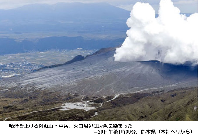山肌も建物も道路も…広がる灰色の景色 阿蘇山噴火上空ルポ ―― 20日午前に噴火した熊本県の阿蘇山・中岳周辺を本社ヘリから撮影した。高度約2千メートルから見下ろした火口周辺は、火山灰などが降り積もり、灰色の景色が広がっていた。