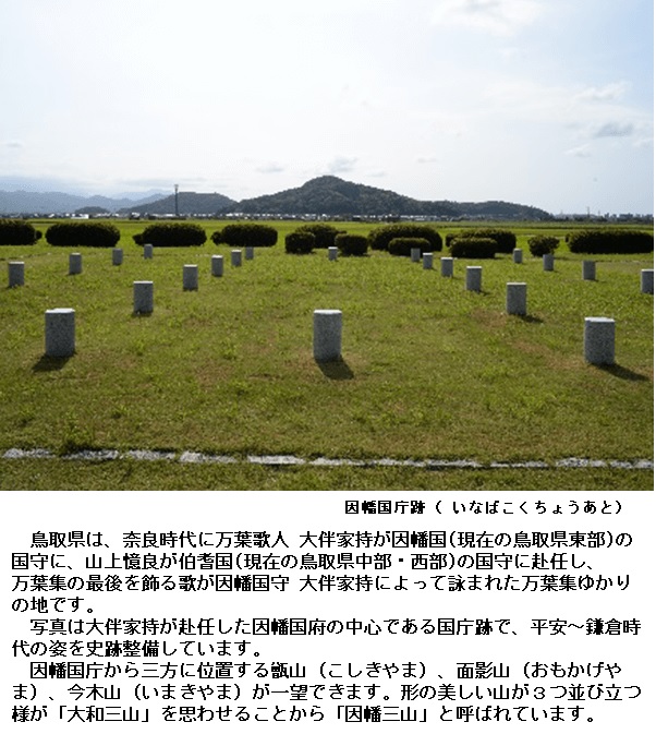 ◎大伴家持(おおとものやかもち)は、因幡守(いなばのかみ)に任じられて、都を去ってゆきました。因幡(いなば)の国は現在の鳥取県東部にあたります。