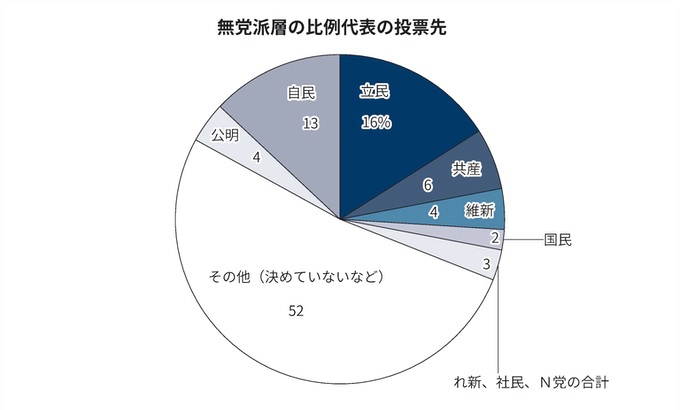 調査で支持政党・好意的な政党がない無党派層は全体の1割弱。このうち16%が立民に投票すると回答し、自民党は13%だった。全国11のブロックごとにみても、北海道、近畿、中国を除く8ブロックで立民がトップだった。