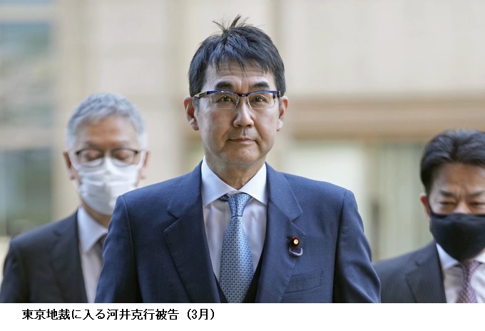 河井元法相、控訴取り下げ 懲役3年の実刑確定 ―― 2019年の参院選広島選挙区を巡る買収事件で、公職選挙法違反(買収、事前運動)の罪で実刑判決を受けた元法相の河井克行被告(58)が21日、控訴を取り下げた。懲役3年、追徴金130万円とした東京地裁判決が確定した。主任弁護人が明らかにした。