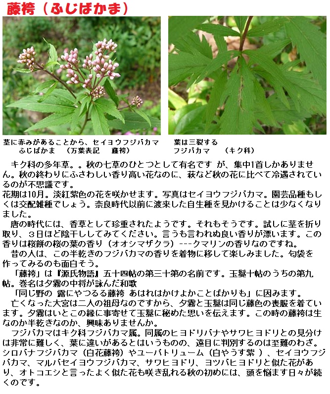 キク科の多年草です。秋の七草のひとつとして有名ですね。8月~9月頃に淡い紫色の小さな花が枝の先に集まるように咲きます。大陸から渡ってきたようで、中国では「香草」と呼ばれています。開花時に乾燥させたものを「蘭草」といい、糖尿病に効くといわれています。