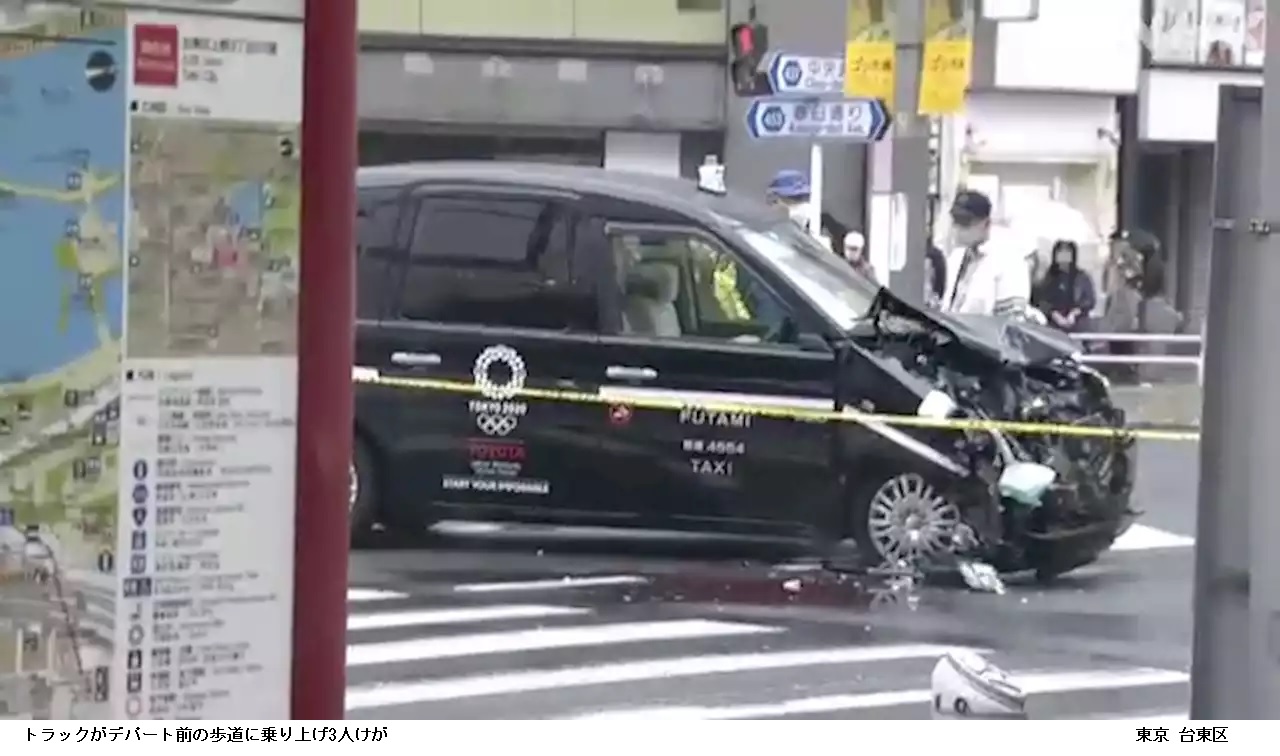 トラックがデパート前の歩道に乗り上げ3人けが 東京 台東区 ―― 22日午前、東京 台東区でタクシーと衝突したトラックが歩道に乗り上げて歩行者をはねる事故があり、男女合わせて3人がけがをしました。