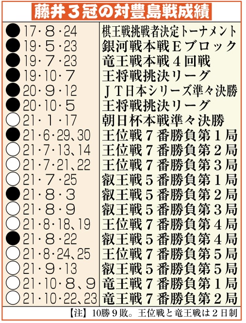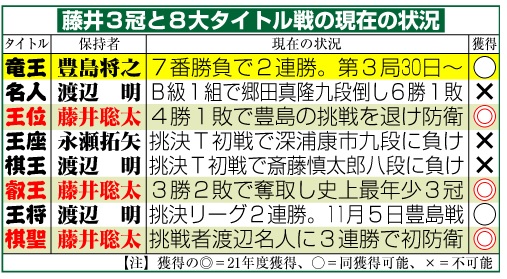 7月には渡辺明名人(37)=棋王・王将と合わせ三冠=の挑戦を3連勝で退けて棋聖位を防衛し、9月には叡王戦で豊島竜王からタイトルを奪って最年少で三冠になった。現在は竜王戦七番勝負で豊島竜王に挑戦し、2連勝している。
