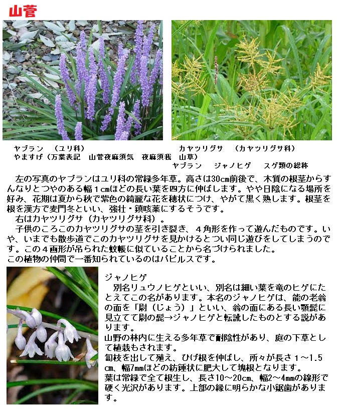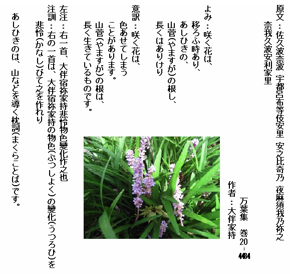 巻20-4484:咲く花は移ろふ時ありあしひきの山菅の根し長くはありけり