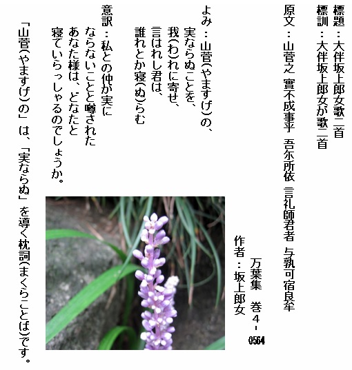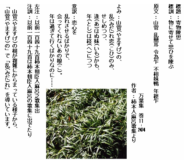 巻11-2474:山菅の乱れ恋のみせしめつつ逢はぬ妹かも年は経につつ
