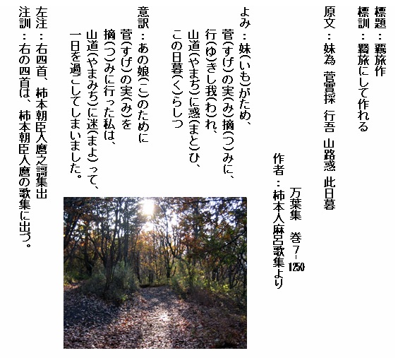 意訳:我が大君の、皇子さまは、神でいらっしゃるままに、神にふさわしく、都をあとにされ、初瀬の山は、真木が立つ荒々しい山道を、岩や木を押し伏せながら、朝に越えられ、、夕になると、雪が降る、安騎(あき)の大野に、旗のようになびくすすきや小竹(しの)を押し伏せて、いにしえを思って旅寝をなさいます。
