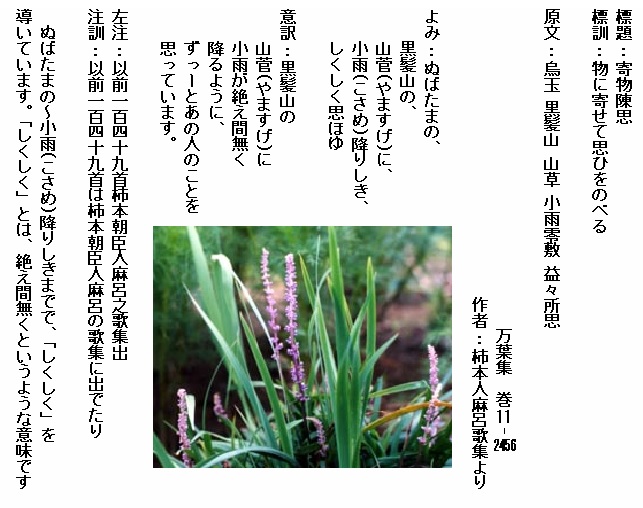 巻11-2456:ぬばたまの黒髪山の山菅に小雨降りしきしくしく思ほゆ
