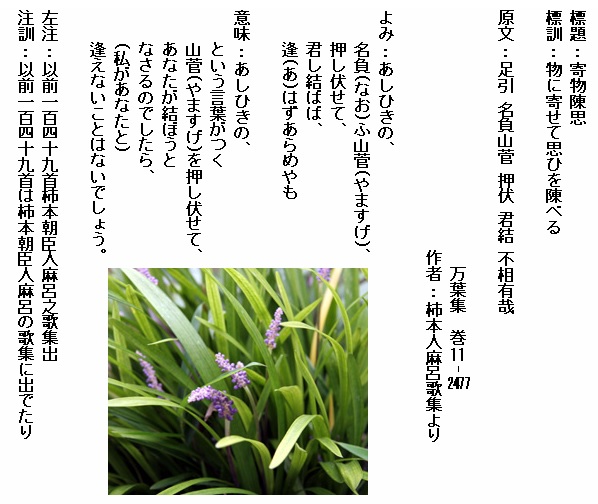巻11-2477:あしひきの名負ふ山菅押し伏せて君し結ばば逢はずあらめやも