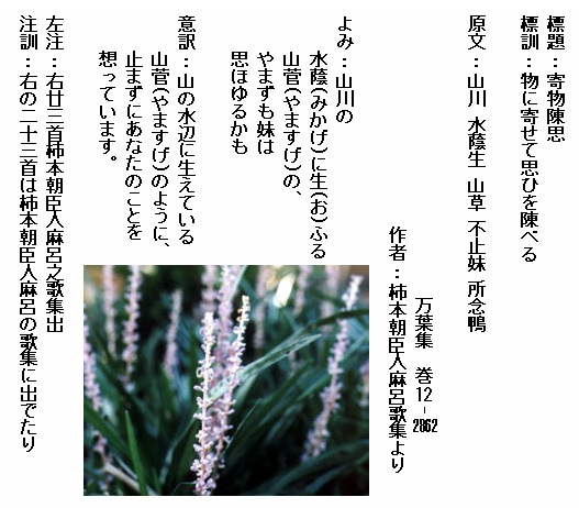 巻12-2862:山川の水蔭に生ふる山菅のやまずも妹は思ほゆるかも