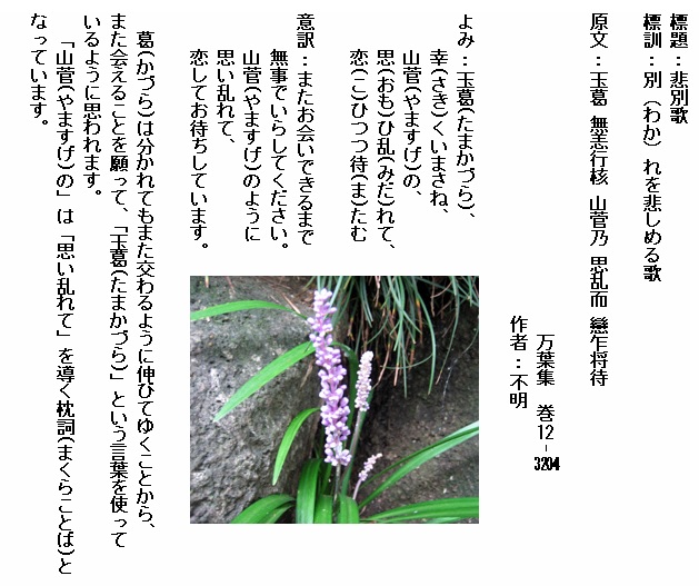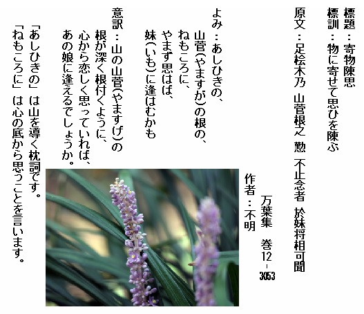 巻12-3051:あしひきの山菅の根のねもころに我れはぞ恋ふる君が姿を