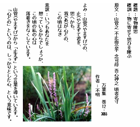巻12-3055:山菅の止まずて君を思へかも我が心どのこの頃はなき