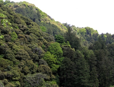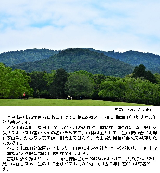 ◎御笠の山は奈良市の市街地東部にある山で標高 283mです。山体はおもに三笠山安山岩から成り、春日断層崖北端に噴出した若草火山岩丘群に属します。東に連なる花山 (狭義の春日山) 、芳山とともに春日山と総称され、原生林でおおわれます。奈良公園の一部で,奈良時代から歌にも詠まれ、文学的にも有名です。北方に続く若草山を俗に三笠山と呼んでいるため、よく混同されます。