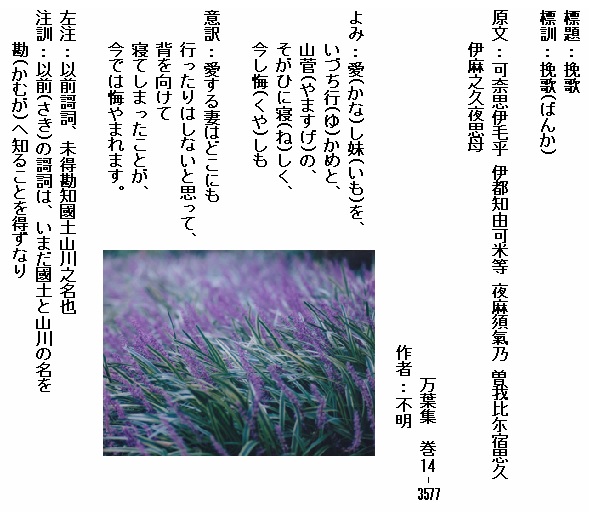 原文:三芳野之 真木立山尓 青生 山菅之根乃 慇懃 吾念君者 天皇之 遣之万々 (或本云、王 命恐) 夷離 國治尓登 (或本云、天踈 夷治尓等) 群鳥之 朝立行者 後有 我可将戀奈 客有者 君可将思 言牟為便 将為須便不知 (或書、有足日木 山之木末尓句也) 延津田乃 歸之 (或本、無歸之句也) 別之數 惜物可聞