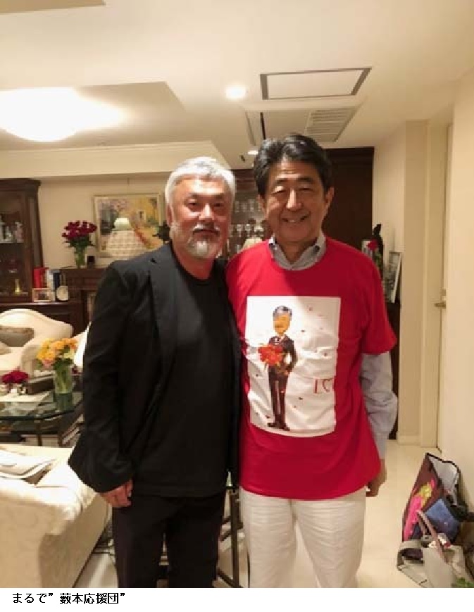 写真を見ると安倍氏は”籔本Tシャツ”をワイシャツの上に着て、満面の笑顔でご機嫌な様子。両者の親密さがひしひしと伝わってくる。