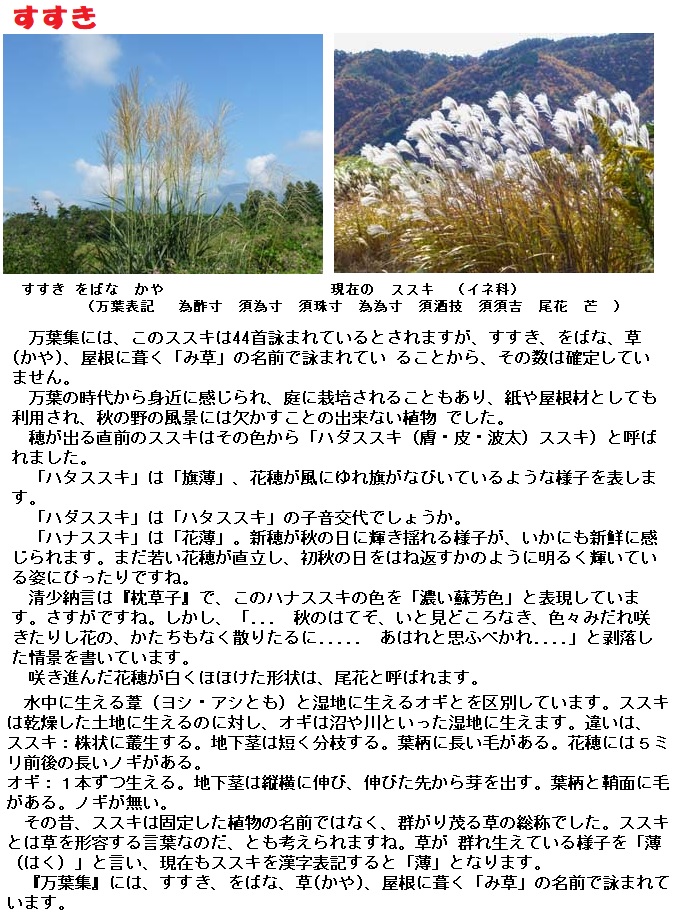 万葉集には、ススキ・をばな・草(かや)・み草の名前で登場します。また、穂が出始めたばかりの尾花(をばな)を"花すすき"・"はだすすき"と詠んでいるようです。