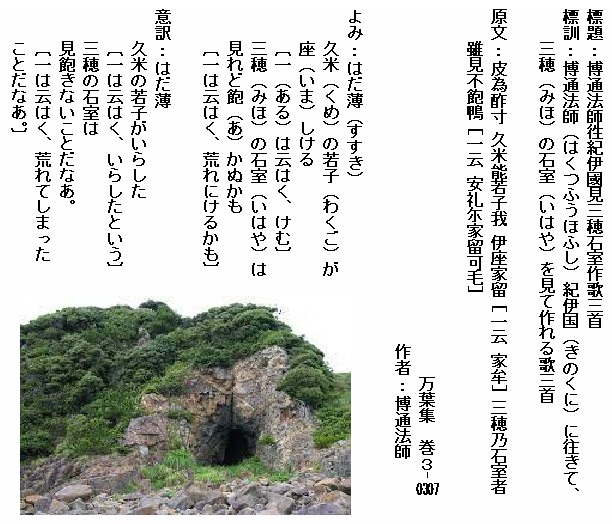 巻3-0307:はだ薄久米の若子がいましける三穂の石室は見れど飽かぬかも
