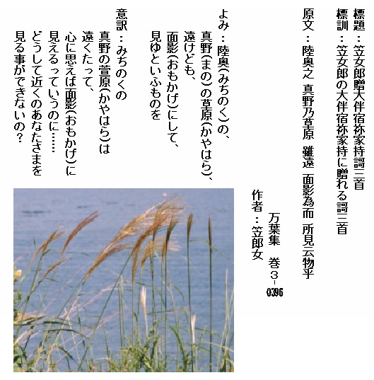 巻3-0396:陸奥の真野の草原遠けども面影にして見ゆといふものを