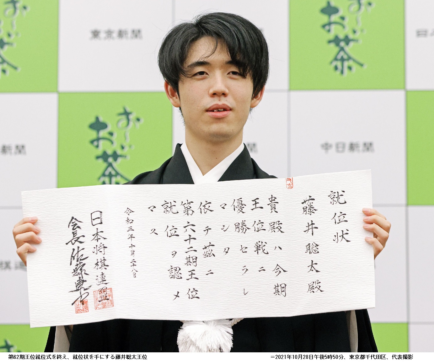 王位の就位式後の記者会見では「豊島竜王を始めトップの方と対戦していただく機会が多く、その中で発見や改善すべき点がある。それを一つ一つ改善して成長していけたらと思う」と話した。 【朝日新聞DIGITAL 2021年10月28日 20時01分】