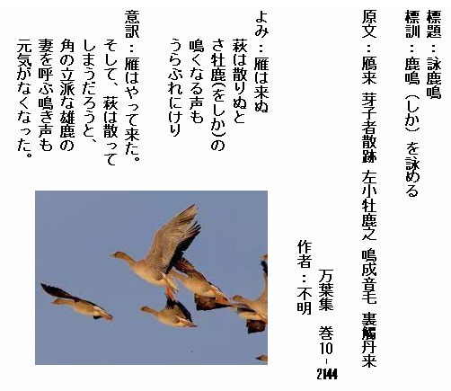 巻10-2144:雁は来ぬ萩は散りぬとさを鹿の鳴くなる声もうらぶれにけり
