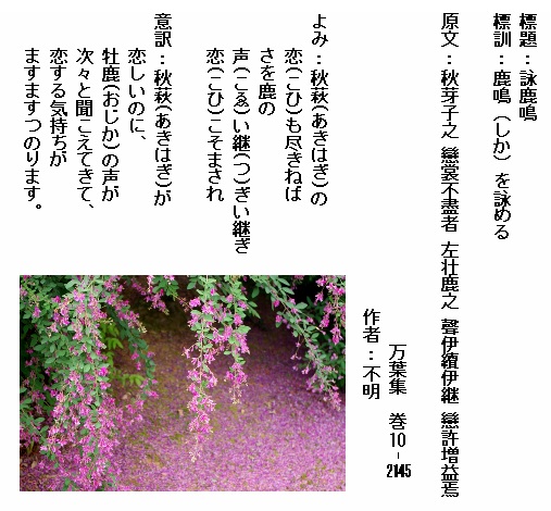 巻10-2145:秋萩の恋も尽きねばさを鹿の声い継ぎい継ぎ恋こそまされ