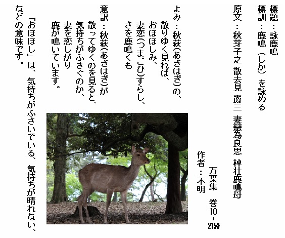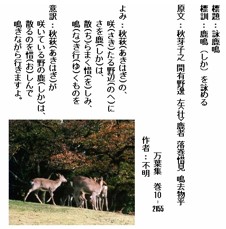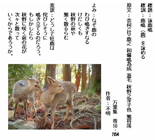 巻10-2154:なぞ鹿のわび鳴きすなるけだしくも秋野の萩や繁く散るらむ