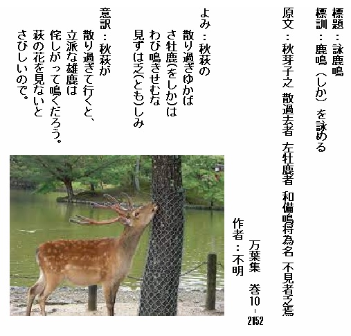巻10-2152:秋萩の散り過ぎゆかばさを鹿はわび鳴きせむな見ずはともしみ