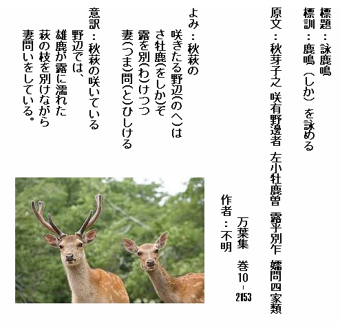 巻10-2153:秋萩の咲きたる野辺はさを鹿ぞ露を別けつつ妻どひしける